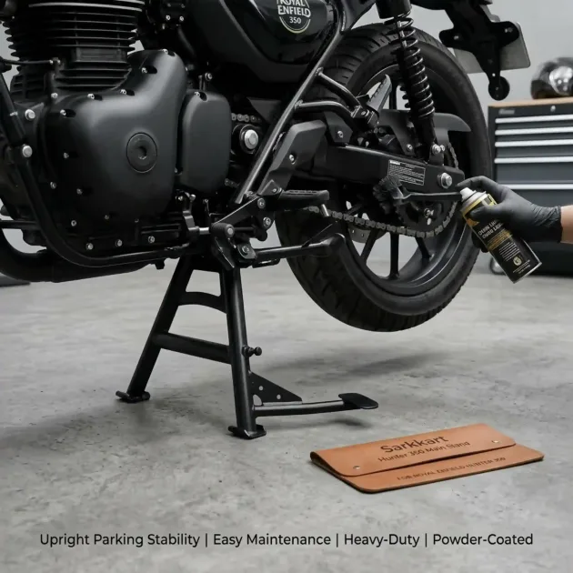 Sarkkart Hunter 350 centre stand with heavy-duty build for stable parking, easy maintenance, and improved bike balance.
